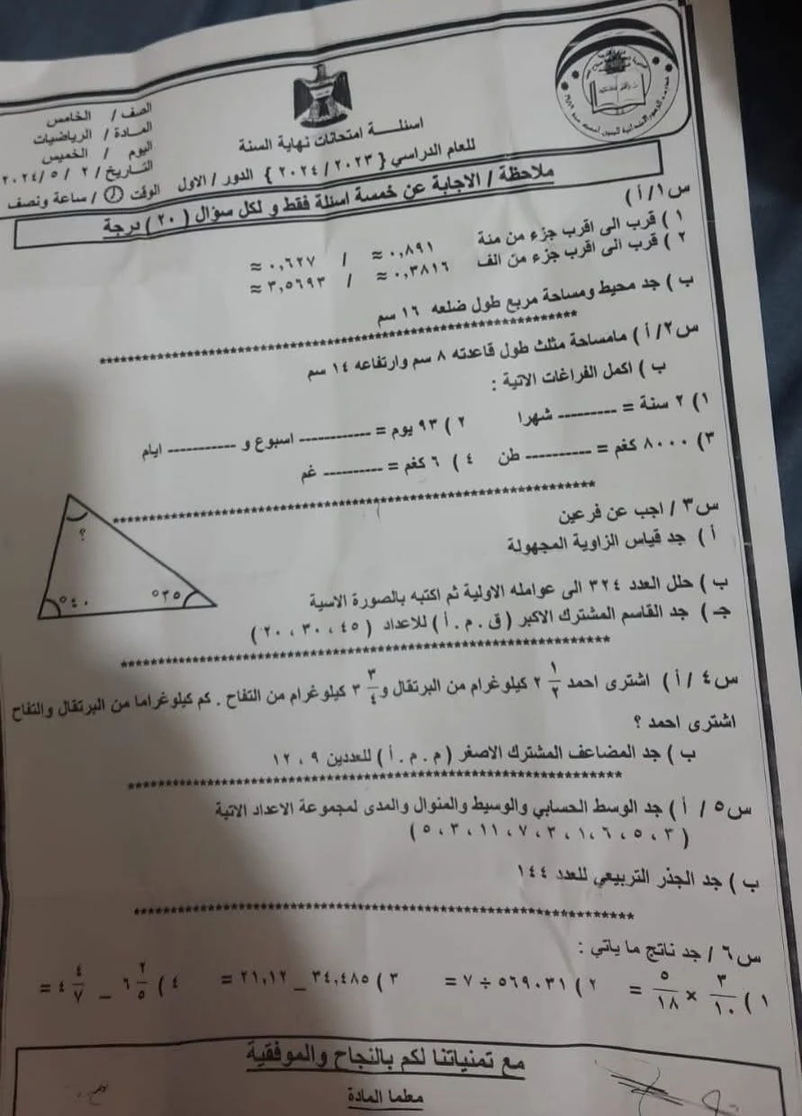 استعدوا لمغامرة أرقام مشوقة مع امتحان الرياضيات النهائي للصف الخامس! 🤩📊📐